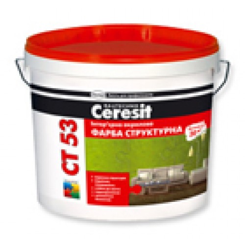 Структурна акрилова фарба Ceresit CT 53 призначена для обробки поверхонь стін та стель усередині будівель. Фарба наноситься як по мінеральних (зокрема, гіпсові штукатурки та плити), так і органічних основах (шпалери, полістирольні плити, фанера, деревостружкові та деревноволокнисті плити). Застосовується також на раніше пофарбованих поверхнях.