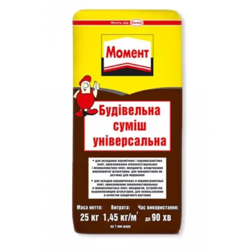 Будівельна суміш універсальна «Момент» призначена для ремонту і вирівнювання бетонних, цегляних, цементно-піщаних підстав стін; облицювання підготовлених підстав керамічною плиткою і плиткою з керамограніту, міцних підстав, не деформуються, усередині будівель.