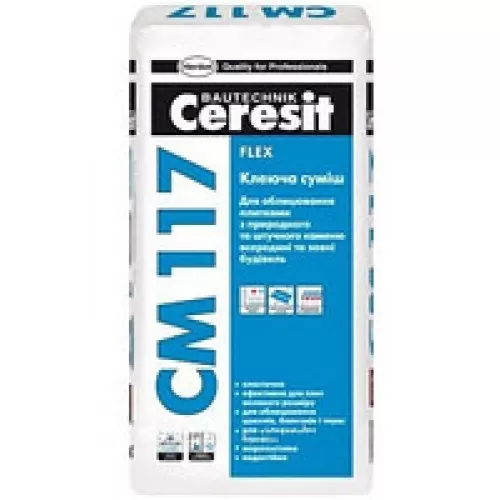Ceresit СМ-117 клей являє собою суху композицію пластифікатора, піску, хімічних добавок і цементу, який призначений для закріплення плитки з поверхнею.
