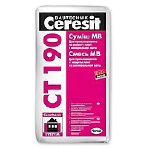 Суміш Ceresit CT 190 призначена для приклеювання мінераловатних плит і пристрою захисного армованого шару при утепленні фасадів будівель і споруд. При застосуванні для утеплення фасадів пінополістирольних плит необхідно використовувати клейові суміші Ceresit CT 85 і Ceresit CT 83 тільки в якості клею і захисного шару.