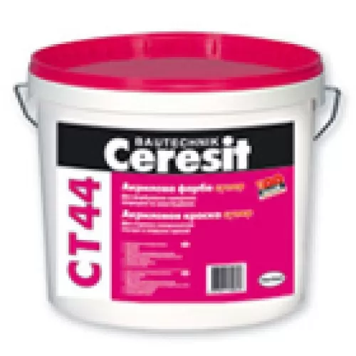 Акрилова фарба Ceresit CT 44 призначена для обробки поверхонь будівельних конструкцій та елементів усередині та зовні будівель. Зовні будівель - з мінеральних основ (бетон, цегла, цементно-піщані штукатурки). Усередині приміщень - як за мінеральними (у тому числі гіпсові штукатурки та плити та ін.), так і органічним основам (шпалери, полістирольні плити, фанера, деревостружкові та деревноволокнисті плити).