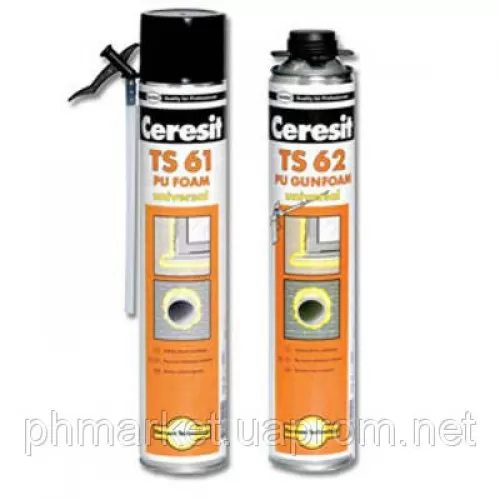 Особливості монтажної піни Ceresit TS 62 - однокомпонентна поліуретанова монтажна піна призначена для монтажу та герметизації віконних і дверних блоків, а також інших будівельних конструкцій, для термоізоляції трубопроводів і сантехнічного обладнання, уплотнення швів, заповнення трещин, пустот і щелей; стійка до перепаду температури від -55°C до +90°C; час схоплювання 7-16 хв.