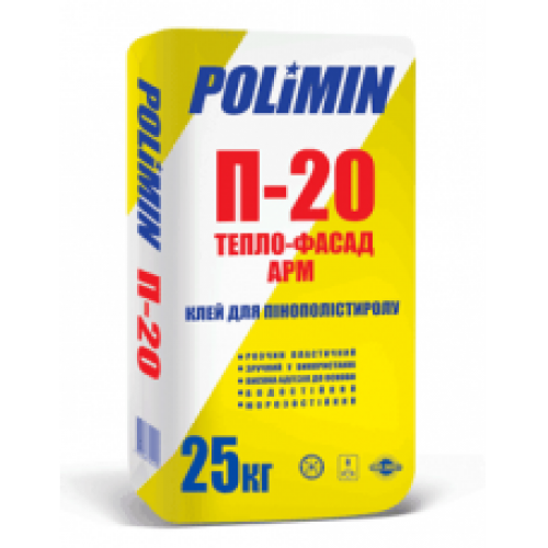 П-20 (25 кг) Клей для пенополистерола ПОЛИМИН Предназначен для приклеивания пенополистирольных плит и минеральной ваты при обустройстве теплоизоляционного слоя на фасаде зданий, а также создания армирующего гидрозащитного покрытия. Расход: 3-5 кг / м2.