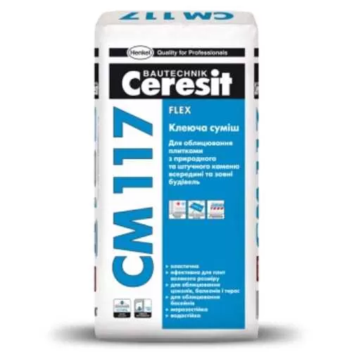 Суміш Ceresit CM 117 призначена для облицювання мінеральних поверхонь з підвищеною щільністю (бетон, природний камінь, asbochefer і т.д.), будь-який мінерал черепичним з природного каменю, скла, щільного бетону, литого каменю (граніт ceramo) і т.д., за винятком мармур.